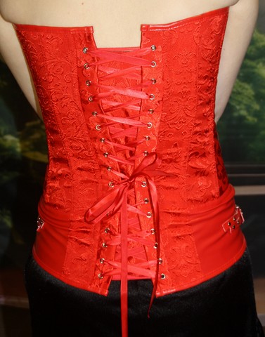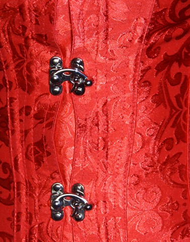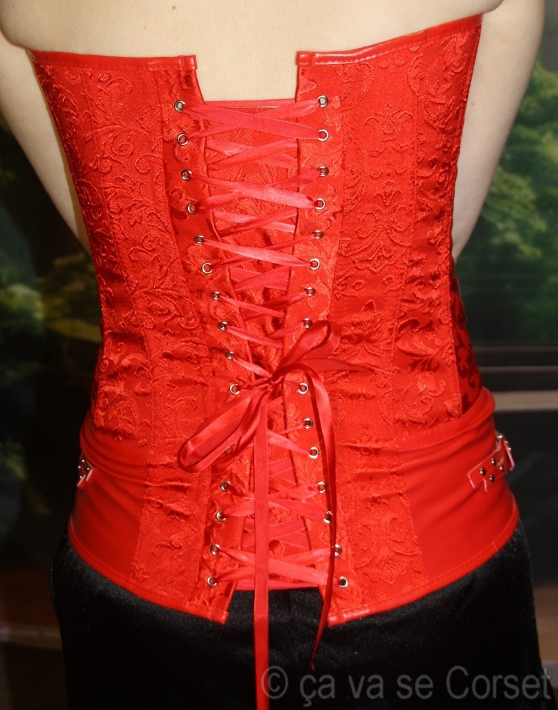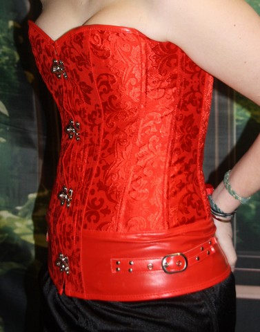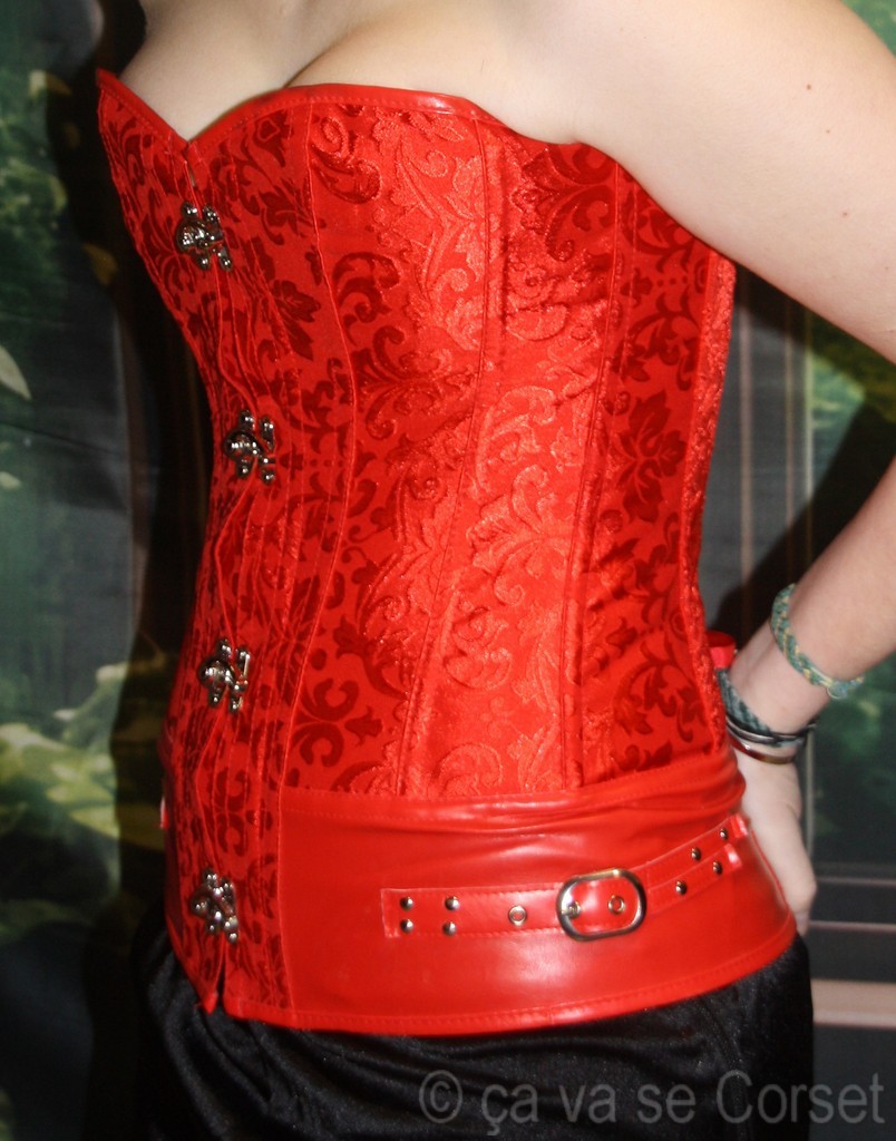 Corset baroque rouge motifs ton sur ton et empiècement vinyl...