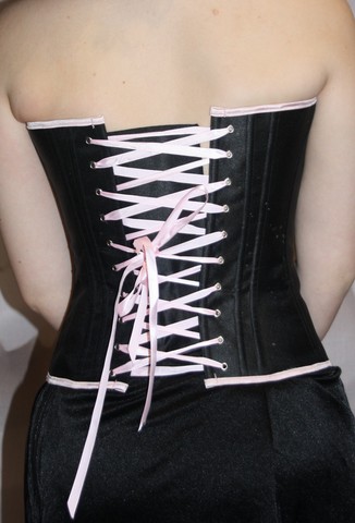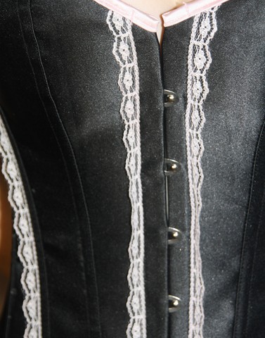 Corset tissu noir version satinée et dentelle blanche.